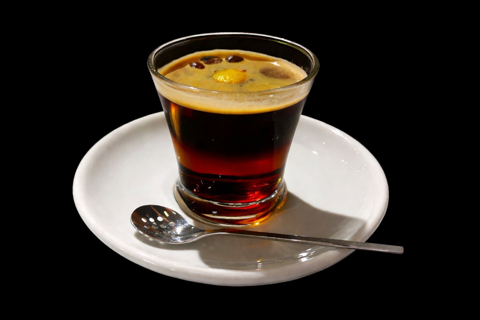 Vaso transparente, 25 ml de Quemaito, 1 carga de café y una raspadura de limón
